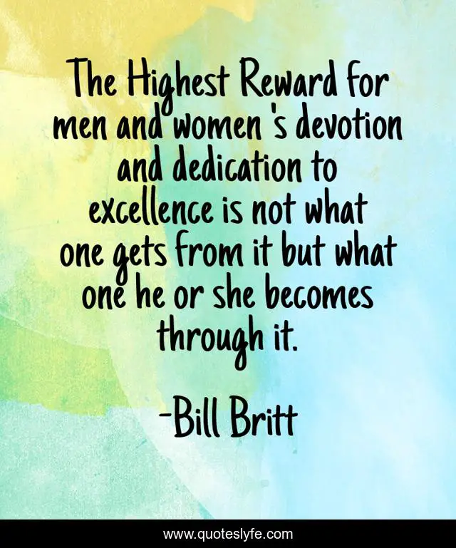 This page presents the quote "The Highest Reward for men and women 's devotion and dedication to excellence is not what one gets from it but what one he or she becomes through it.". Author of this quote is Bill Britt. This quote is about enthusiasm, business, inspirational, business-leaders,.
