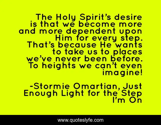 This page presents the quote "The Holy Spirit’s desire is that we become more and more dependent upon Him for every step. That’s because He wants to take us to places we’ve never been before. To heights we can’t even imagine!". Author of this quote is Stormie Omartian, Just Enough Light for the Step I'm On. This quote is about desire, motivation, love, dependent, god, prayer, holy-spirit, affection, inspiration,.