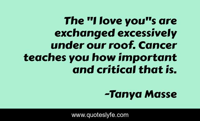 This page presents the quote "The "I love you"s are exchanged excessively under our roof. Cancer teaches you how important and critical that is.". Author of this quote is Tanya Masse. This quote is about life, quotes-about-cancer, cancer, i-love-you, quotes-about-life,.