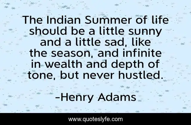 This page presents the quote "The Indian Summer of life should be a little sunny and a little sad, like the season, and infinite in wealth and depth of tone, but never hustled.". Author of this quote is Henry Adams. This quote is about summer, life, wealth,.