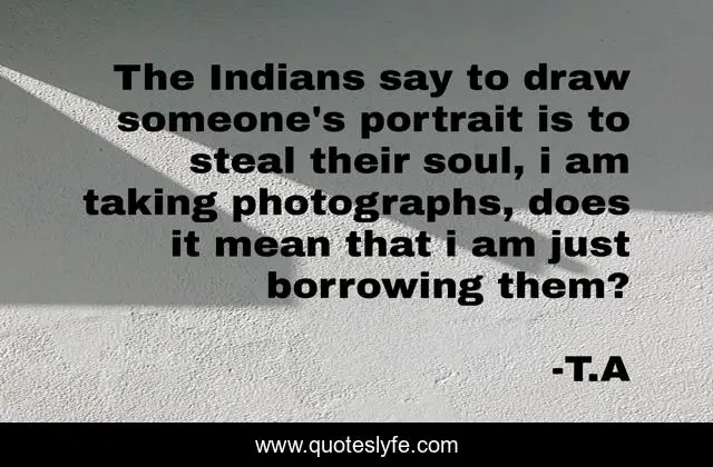 This page presents the quote "The Indians say to draw someone's portrait is to steal their soul, i am taking photographs, does it mean that i am just borrowing them?". Author of this quote is T.A. This quote is about photography, creativity,.