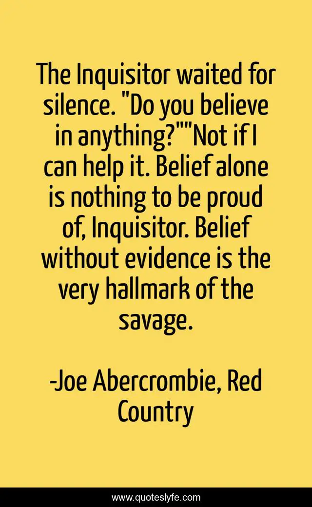 This page presents the quote "The Inquisitor waited for silence. "Do you believe in anything?""Not if I can help it. Belief alone is nothing to be proud of, Inquisitor. Belief without evidence is the very hallmark of the savage.". Author of this quote is Joe Abercrombie, Red Country. This quote is about abercrombie, cosca, belief, epic-fantasy,.