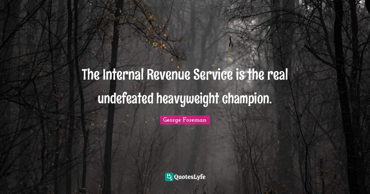 This page presents the quote "The Internal Revenue Service is the real undefeated heavyweight champion.". Author of this quote is George Foreman. This quote is about undefeated, champion, sports, real, boxing, revenue,.