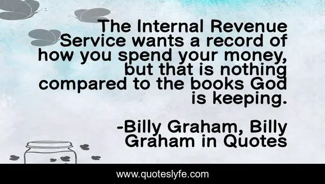 This page presents the quote "The Internal Revenue Service wants a record of how you spend your money, but that is nothing compared to the books God is keeping.". Author of this quote is Billy Graham, Billy Graham in Quotes. This quote is about money, billy-graham,.