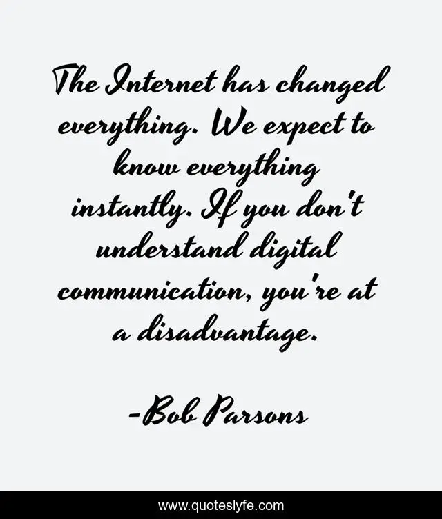 This page presents the quote "The Internet has changed everything. We expect to know everything instantly. If you don't understand digital communication, you're at a disadvantage.". Author of this quote is Bob Parsons. This quote is about internet, digital,.