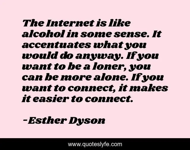 This page presents the quote "The Internet is like alcohol in some sense. It accentuates what you would do anyway. If you want to be a loner, you can be more alone. If you want to connect, it makes it easier to connect.". Author of this quote is Esther Dyson. This quote is about addiction, technology, idolatry, internet,.