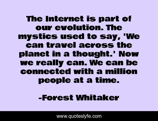 This page presents the quote "The Internet is part of our evolution. The mystics used to say, 'We can travel across the planet in a thought.' Now we really can. We can be connected with a million people at a time.". Author of this quote is Forest Whitaker. This quote is about people, time, internet,.