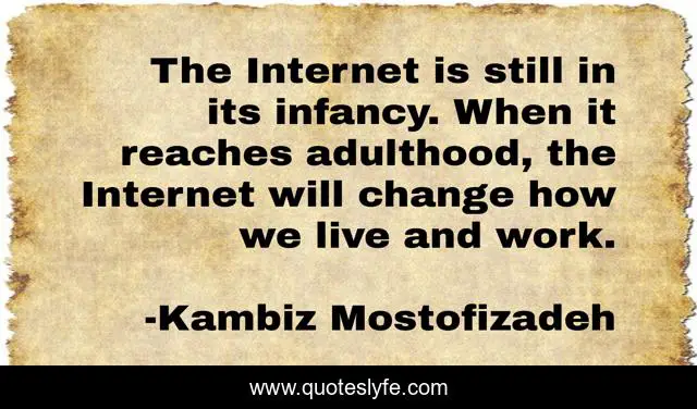 This page presents the quote "The Internet is still in its infancy. When it reaches adulthood, the Internet will change how we live and work.". Author of this quote is Kambiz Mostofizadeh. This quote is about science, internet, technology, kambiz-mostofizadeh, future-inspirational,.
