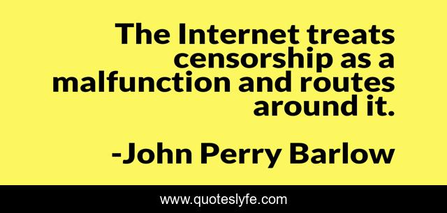This page presents the quote "The Internet treats censorship as a malfunction and routes around it.". Author of this quote is John Perry Barlow. This quote is about treats, censorship, internet,.