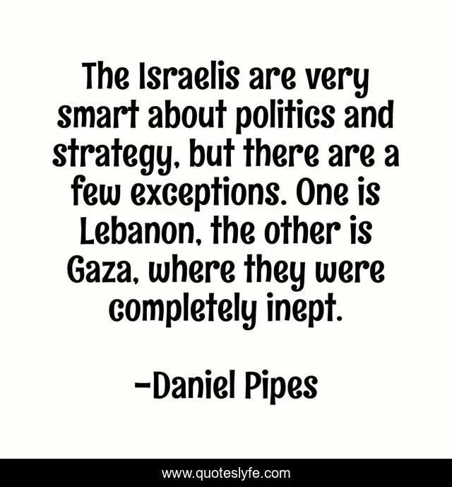 This page presents the quote "The Israelis are very smart about politics and strategy, but there are a few exceptions. One is Lebanon, the other is Gaza, where they were completely inept.". Author of this quote is Daniel Pipes. This quote is about smart, strategy,.