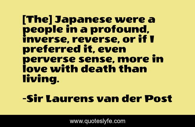 This page presents the quote "[The] Japanese were a people in a profound, inverse, reverse, or if I preferred it, even perverse sense, more in love with death than living.". Author of this quote is Sir Laurens van der Post. This quote is about living, life, death, romantic, ww2, philosophy, japanese, honor, romance,.