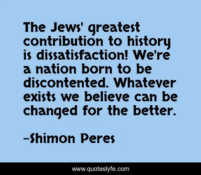 This page presents the quote "The Jews' greatest contribution to history is dissatisfaction! We're a nation born to be discontented. Whatever exists we believe can be changed for the better.". Author of this quote is Shimon Peres. This quote is about believe, greatest,.