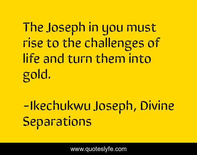This page presents the quote "The Joseph in you must rise to the challenges of life and turn them into gold.". Author of this quote is Ikechukwu Joseph, Divine Separations. This quote is about christianity, covenant-rights,.