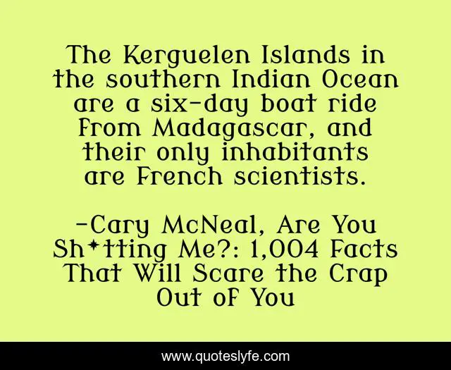 This page presents the quote "The Kerguelen Islands in the southern Indian Ocean are a six-day boat ride from Madagascar, and their only inhabitants are French scientists.". Author of this quote is Cary McNeal, Are You Sh*tting Me?: 1,004 Facts That Will Scare the Crap Out of You. This quote is about facts, humor,.
