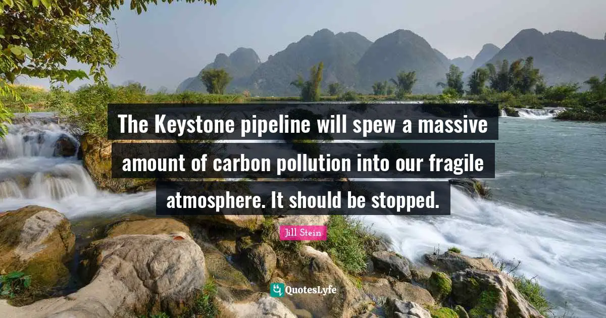 This page presents the quote "The Keystone pipeline will spew a massive amount of carbon pollution into our fragile atmosphere. It should be stopped.". Author of this quote is Jill Stein. This quote is about amount, pollution, massive, carbon, keystone pipeline, fragile, atmosphere,.