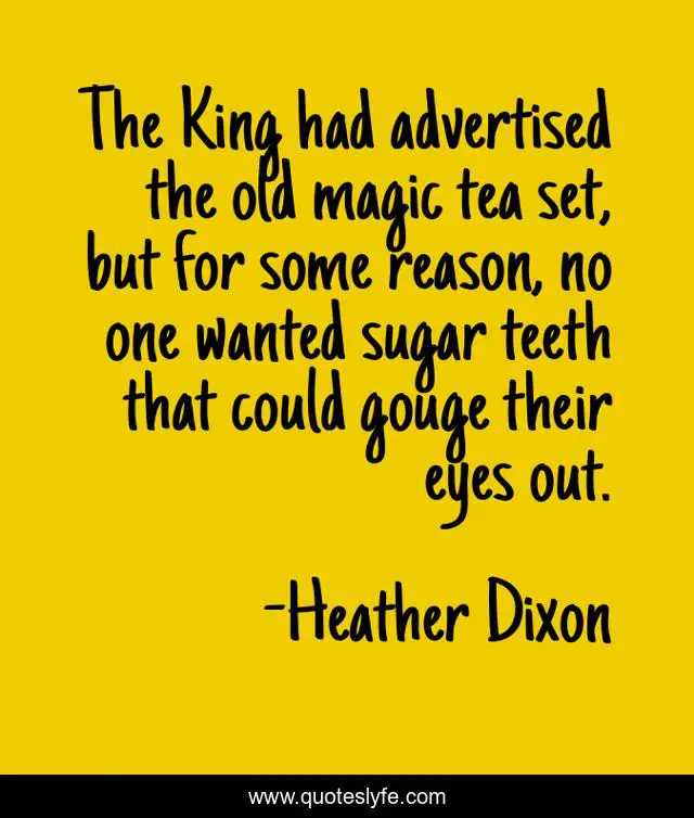 This page presents the quote "The King had advertised the old magic tea set, but for some reason, no one wanted sugar teeth that could gouge their eyes out.". Author of this quote is Heather Dixon. This quote is about magic, humerous,.