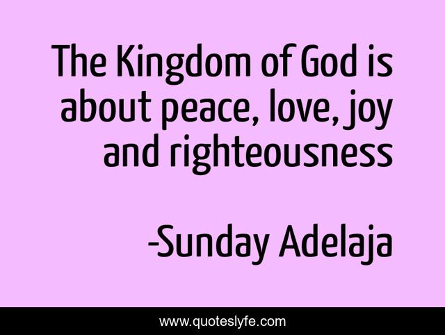 This page presents the quote "The Kingdom of God is about peace, love, joy and righteousness". Author of this quote is Sunday Adelaja. This quote is about righteousness-of-christ, righteous, life, blessing, love, finance, joy, peace, righteousness,.