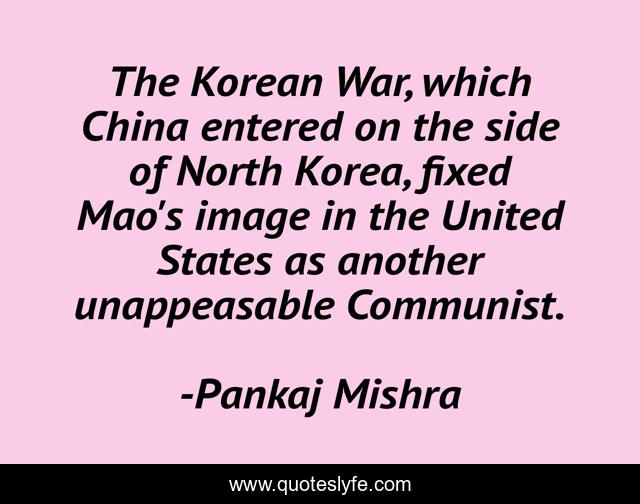 This page presents the quote "The Korean War, which China entered on the side of North Korea, fixed Mao's image in the United States as another unappeasable Communist.". Author of this quote is Pankaj Mishra. This quote is about communist, china, image,.