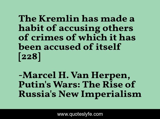 This page presents the quote "The Kremlin has made a habit of accusing others of crimes of which it has been accused of itself [228]". Author of this quote is Marcel H. Van Herpen, Putin's Wars: The Rise of Russia's New Imperialism. This quote is about crime, war, russia, propaganda,.