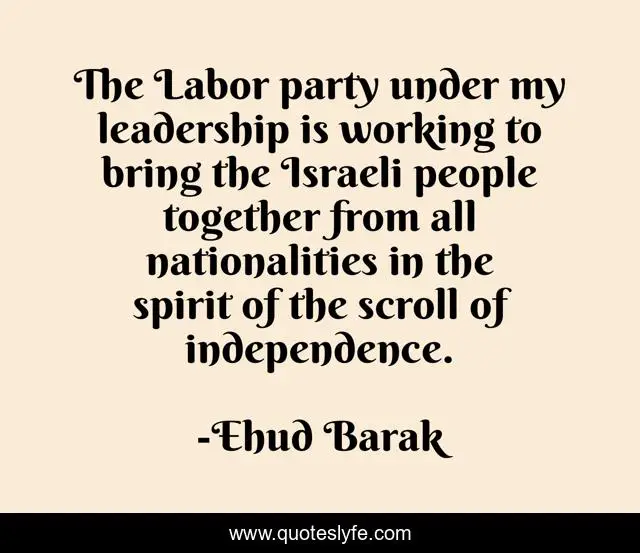 This page presents the quote "The Labor party under my leadership is working to bring the Israeli people together from all nationalities in the spirit of the scroll of independence.". Author of this quote is Ehud Barak. This quote is about leadership, together, people,.