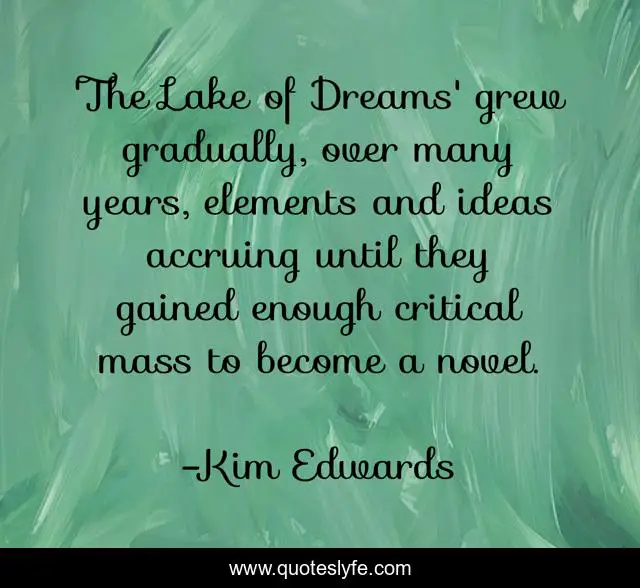 This page presents the quote "'The Lake of Dreams' grew gradually, over many years, elements and ideas accruing until they gained enough critical mass to become a novel.". Author of this quote is Kim Edwards. This quote is about lake, ideas, years,.