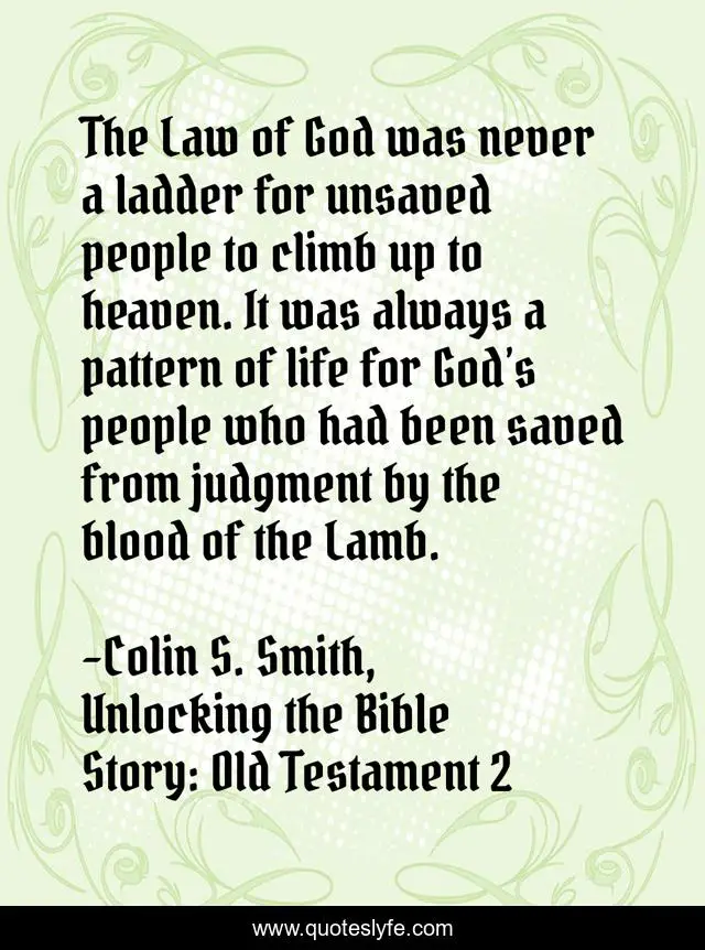 This page presents the quote "The Law of God was never a ladder for unsaved people to climb up to heaven. It was always a pattern of life for God’s people who had been saved from judgment by the blood of the Lamb.". Author of this quote is Colin S. Smith, Unlocking the Bible Story: Old Testament 2. This quote is about jesus-christ, the-law, heaven, salvation, god, judgment,.