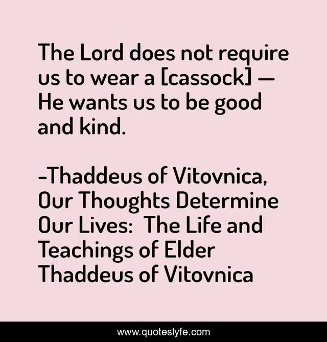 This page presents the quote "The Lord does not require us to wear a [cassock] — He wants us to be good and kind.". Author of this quote is Thaddeus of Vitovnica, Our Thoughts Determine Our Lives: The Life and Teachings of Elder Thaddeus of Vitovnica. This quote is about jesus-christ, christianity, monasticism, spirituality, eastern-orthodoxy, kindness,.