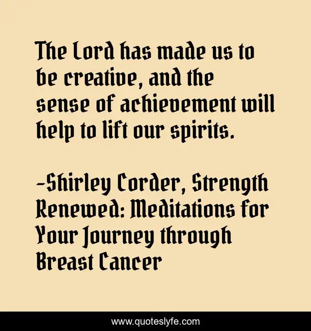 This page presents the quote "The Lord has made us to be creative, and the sense of achievement will help to lift our spirits.". Author of this quote is Shirley Corder, Strength Renewed: Meditations for Your Journey through Breast Cancer. This quote is about enthusiasm, lord-peter-wimsey, achievement, inspirational, creative,.