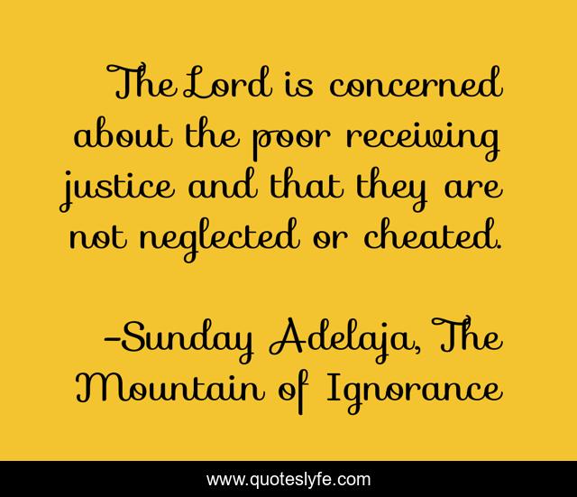 This page presents the quote "The Lord is concerned about the poor receiving justice and that they are not neglected or cheated.". Author of this quote is Sunday Adelaja, The Mountain of Ignorance. This quote is about poor, mountain, life, darkness, power, danger, cheat, god, people,.