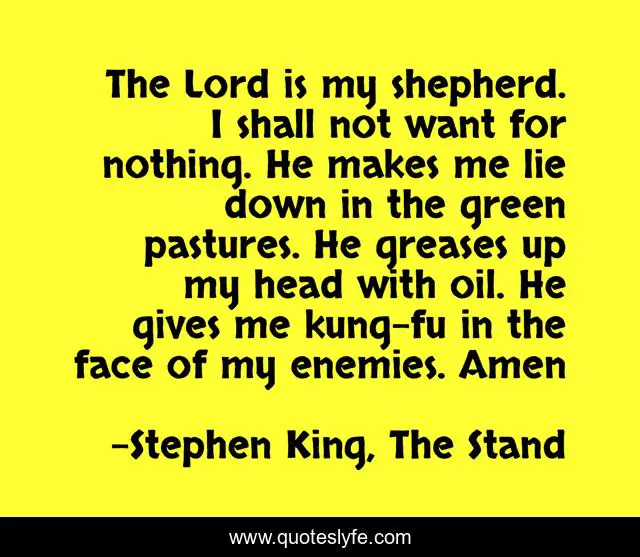 This page presents the quote "The Lord is my shepherd. I shall not want for nothing. He makes me lie down in the green pastures. He greases up my head with oil. He gives me kung-fu in the face of my enemies. Amen". Author of this quote is Stephen King, The Stand. This quote is about enthusiasm, humor, inspirational,.
