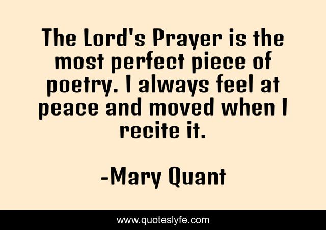 This page presents the quote "The Lord's Prayer is the most perfect piece of poetry. I always feel at peace and moved when I recite it.". Author of this quote is Mary Quant. This quote is about perfect, peace, prayer,.