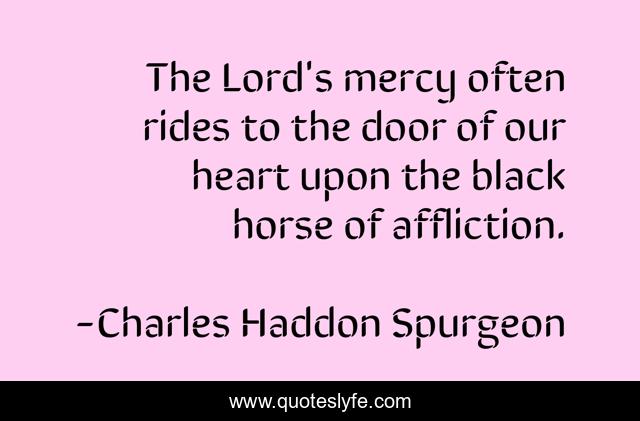 This page presents the quote "The Lord's mercy often rides to the door of our heart upon the black horse of affliction.". Author of this quote is Charles Haddon Spurgeon. This quote is about mercy, affliction, cross-bearing, trials,.