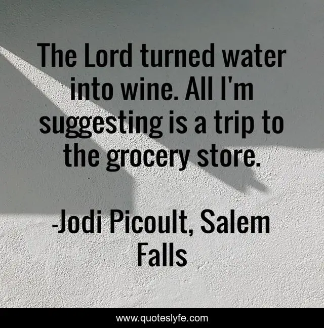 This page presents the quote "The Lord turned water into wine. All I'm suggesting is a trip to the grocery store.". Author of this quote is Jodi Picoult, Salem Falls. This quote is about humorous, funny, comedy,.