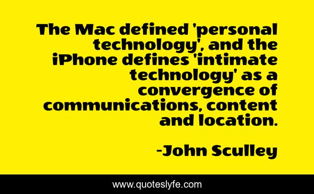 This page presents the quote "The Mac defined 'personal technology', and the iPhone defines 'intimate technology' as a convergence of communications, content and location.". Author of this quote is John Sculley. This quote is about content, personal, iphone,.
