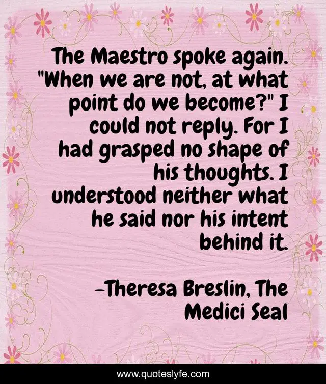 This page presents the quote "The Maestro spoke again. "When we are not, at what point do we become?" I could not reply. For I had grasped no shape of his thoughts. I understood neither what he said nor his intent behind it.". Author of this quote is Theresa Breslin, The Medici Seal. This quote is about life, post-mortem, dissection, matteo, leonardo-da-vinci, understanding, existence,.