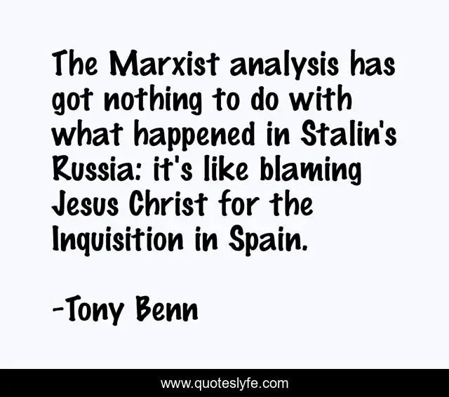 This page presents the quote "The Marxist analysis has got nothing to do with what happened in Stalin's Russia: it's like blaming Jesus Christ for the Inquisition in Spain.". Author of this quote is Tony Benn. This quote is about socialism, political,.