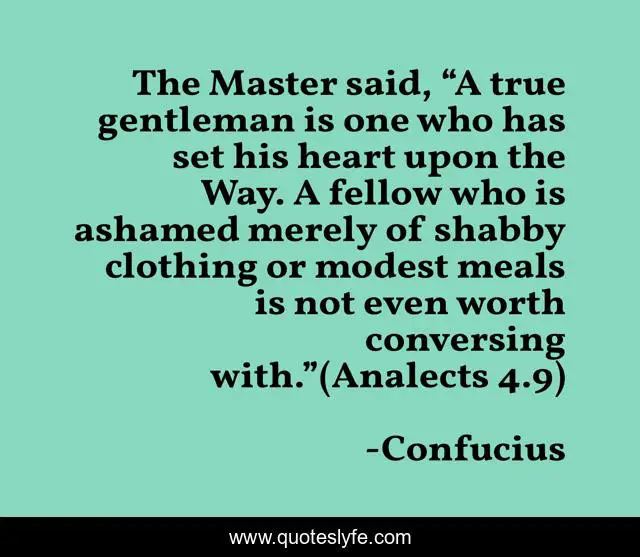 This page presents the quote "The Master said, “A true gentleman is one who has set his heart upon the Way. A fellow who is ashamed merely of shabby clothing or modest meals is not even worth conversing with.”(Analects 4.9)". Author of this quote is Confucius. This quote is about simplicity, consumerism, capitalism, china, virtue, greed, materialism,.