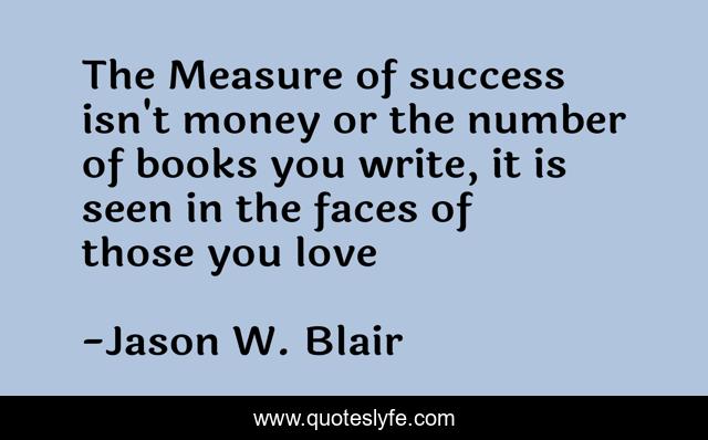 This page presents the quote "The Measure of success isn't money or the number of books you write, it is seen in the faces of those you love". Author of this quote is Jason W. Blair. This quote is about confidence, author, positive, motivational, optimistic, inspirational, enthusiasm,.