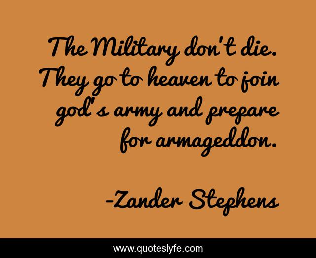 This page presents the quote "The Military don't die. They go to heaven to join god's army and prepare for armageddon.". Author of this quote is Zander Stephens. .