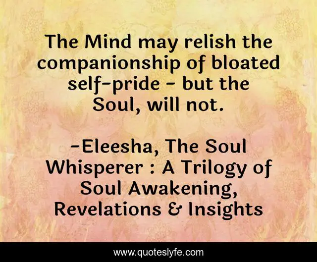 This page presents the quote "The Mind may relish the companionship of bloated self-pride - but the Soul, will not.". Author of this quote is Eleesha, The Soul Whisperer : A Trilogy of Soul Awakening, Revelations & Insights. This quote is about empowerment, positive, motivational, soul, quotes, channeling, inspirational, affirmations, enthusiasm,.