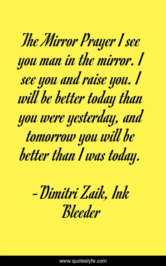 This page presents the quote "The Mirror Prayer I see you man in the mirror. I see you and raise you. I will be better today than you were yesterday, and tomorrow you will be better than I was today.". Author of this quote is Dimitri Zaik, Ink Bleeder. This quote is about mantra, prayer, self-awareness, self-improvement, self-realization,.