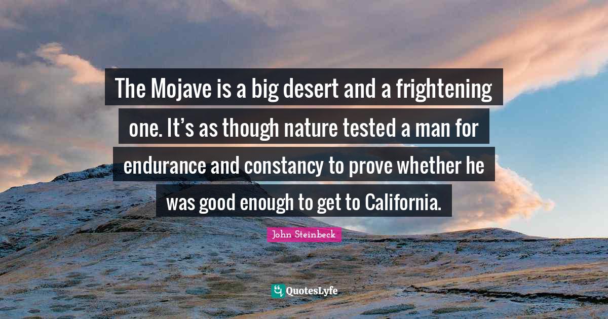 This page presents the quote "The Mojave is a big desert and a frightening one. It’s as though nature tested a man for endurance and constancy to prove whether he was good enough to get to California.". Author of this quote is John Steinbeck. This quote is about frightening, men, prove, good enough, mojave, constancy, tested, desert, nature,.