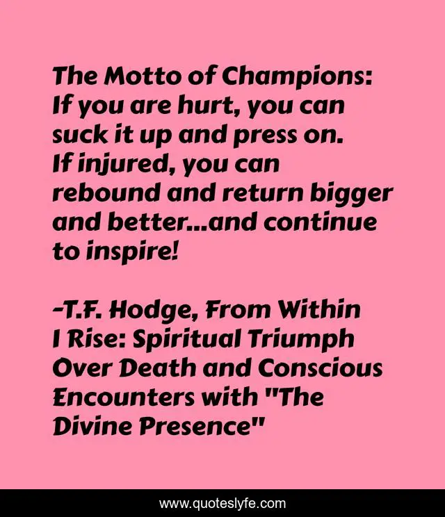 This page presents the quote "The Motto of Champions: If you are hurt, you can suck it up and press on. If injured, you can rebound and return bigger and better...and continue to inspire!". Author of this quote is T.F. Hodge, From Within I Rise: Spiritual Triumph Over Death and Conscious Encounters with "The Divine Presence". This quote is about injured, rebirth, inspire, rebound, hurt, quotes, achievement, inspirational, enthusiasm,.