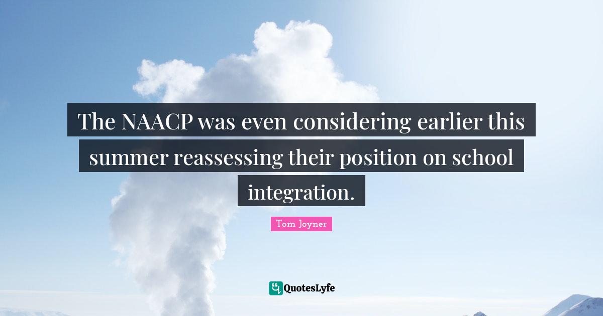 This page presents the quote "The NAACP was even considering earlier this summer reassessing their position on school integration.". Author of this quote is Tom Joyner. This quote is about naacp, considering, position, summer, school, integration,.
