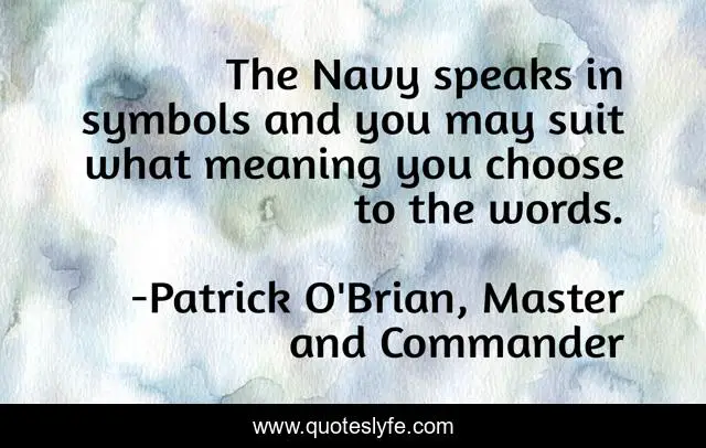 This page presents the quote "The Navy speaks in symbols and you may suit what meaning you choose to the words.". Author of this quote is Patrick O'Brian, Master and Commander. This quote is about navy, symbolism, meaning, at-sea, naval,.