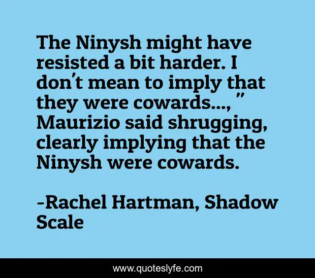 This page presents the quote "The Ninysh might have resisted a bit harder. I don't mean to imply that they were cowards..., " Maurizio said shrugging, clearly implying that the Ninysh were cowards.". Author of this quote is Rachel Hartman, Shadow Scale. This quote is about cowardice, coward, persuasion, surrender,.