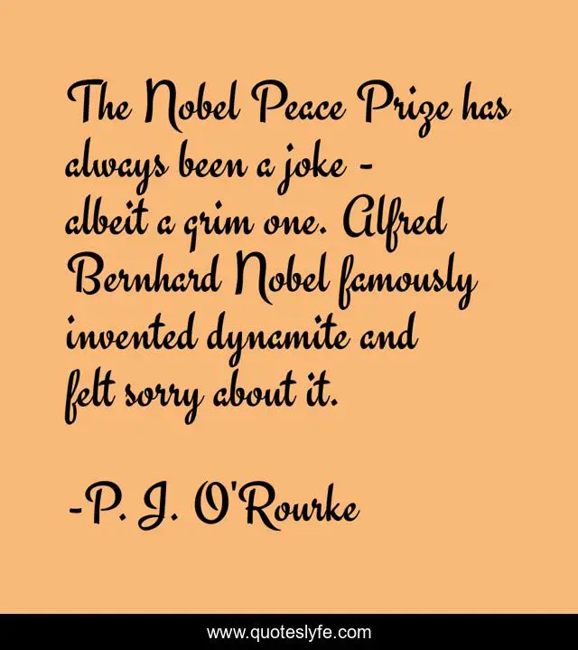 This page presents the quote "The Nobel Peace Prize has always been a joke - albeit a grim one. Alfred Bernhard Nobel famously invented dynamite and felt sorry about it.". Author of this quote is P. J. O'Rourke. This quote is about joke, sorry, always,.