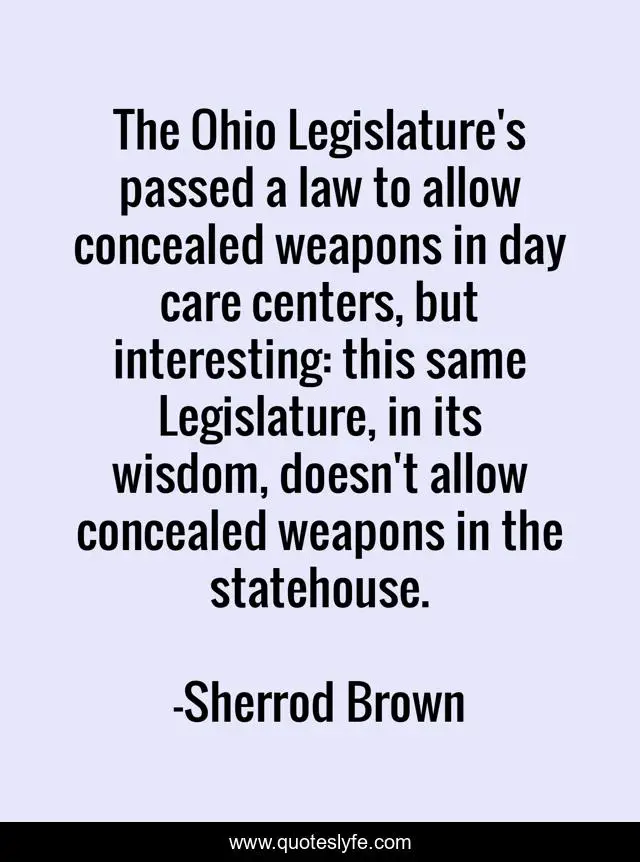 This page presents the quote "The Ohio Legislature's passed a law to allow concealed weapons in day care centers, but interesting: this same Legislature, in its wisdom, doesn't allow concealed weapons in the statehouse.". Author of this quote is Sherrod Brown. This quote is about law, day, care,.