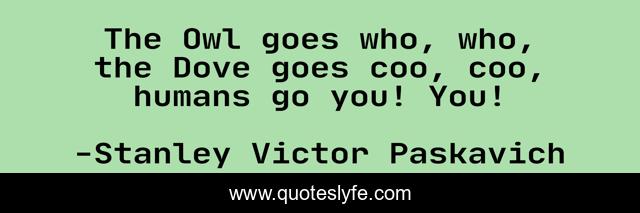 This page presents the quote "The Owl goes who, who, the Dove goes coo, coo, humans go you! You!". Author of this quote is Stanley Victor Paskavich. .