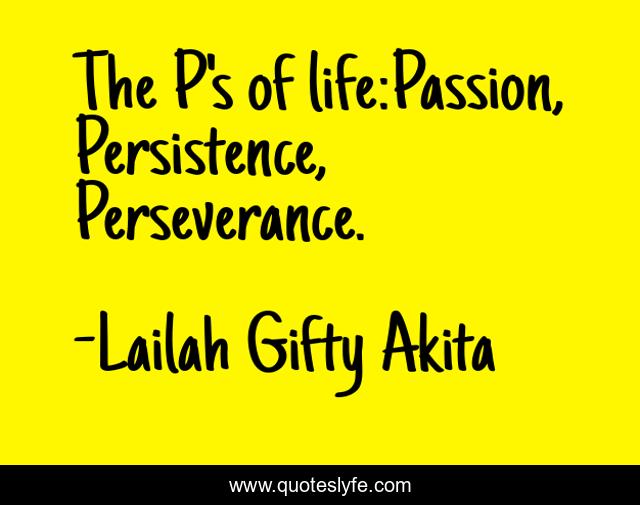 This page presents the quote "The P's of life:Passion, Persistence, Perseverance.". Author of this quote is Lailah Gifty Akita. This quote is about perseverance, life, determination, persistence, passionate-life,.